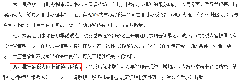 八、推行納稅人網上解鎖報稅盤。稅務總局優(yōu)化增值稅發(fā)票管理新系統,增加納稅人端異常清卡解鎖功能,納稅人報稅盤異常鎖死時,可網上申請解鎖,稅務機關根據規(guī)定流程核實處理,排除風險后及時解鎖。