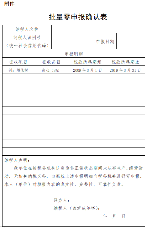 (一)處于非正常狀態(tài)納稅人在辦理稅務注銷前,需先解除非正常狀態(tài),補辦納稅申報手續(xù)。符合以下情形的,稅務機關可打印相應稅種和相關附加的《批量零申報確認表》(見附件),經納稅人確認后,進行批量處理:
