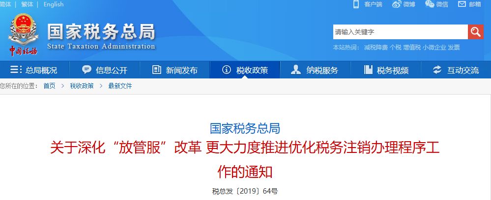 更大力度推進優(yōu)化稅務注銷辦理程序,是進一步貫徹落實黨中央、國務院關于深化“放管服”改革、優(yōu)化營商環(huán)境要求的重要舉措。各地稅務機關要高度重視,抓好落實,并嚴格按照法律、行政法規(guī)規(guī)定的程序和本通知要求辦理相關事項。